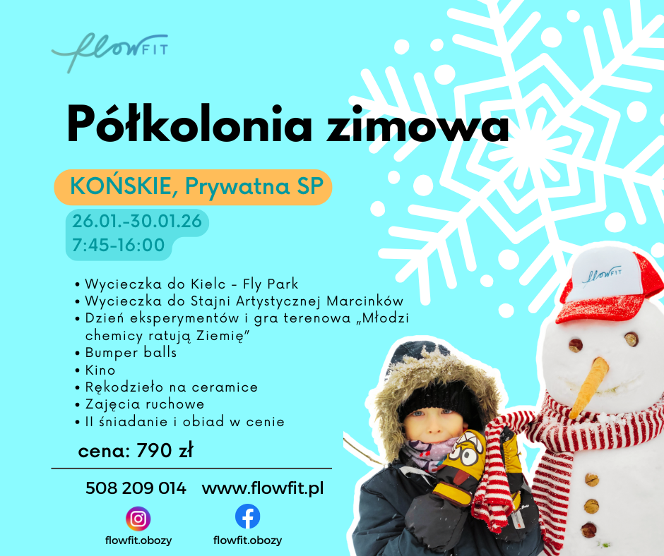 [ogłoszenie płatne] Flow Fit Aktywne Obozy ponownie przygotowało propozycję dla dzieci, które zimowe ferie chcą spędzić aktywnie i w dobrej atmosferze. W drugim tygodniu ferii w Końskich odbędzie się półkolonia zimowa, łącząca sport, wycieczki i codzienną porcję atrakcji. Zapisy prowadzone są TUTAJ, a więcej informacji można uzyskać pod numerem tel. 508 209 014 lub mailowo [email protected]